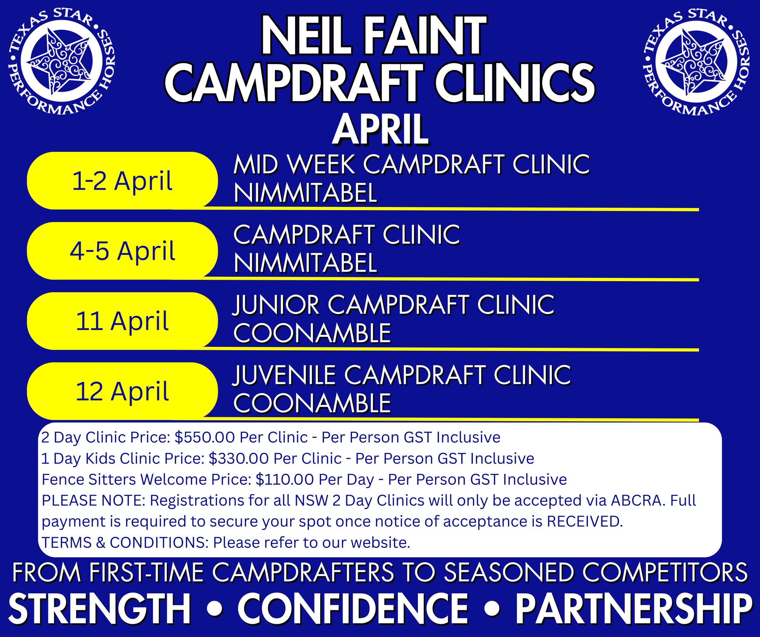 Nominations for our April Neil Faint Campdraft Clinics will be opening soon via ABCRA iCompete. See dates and locations in the graphic below.
