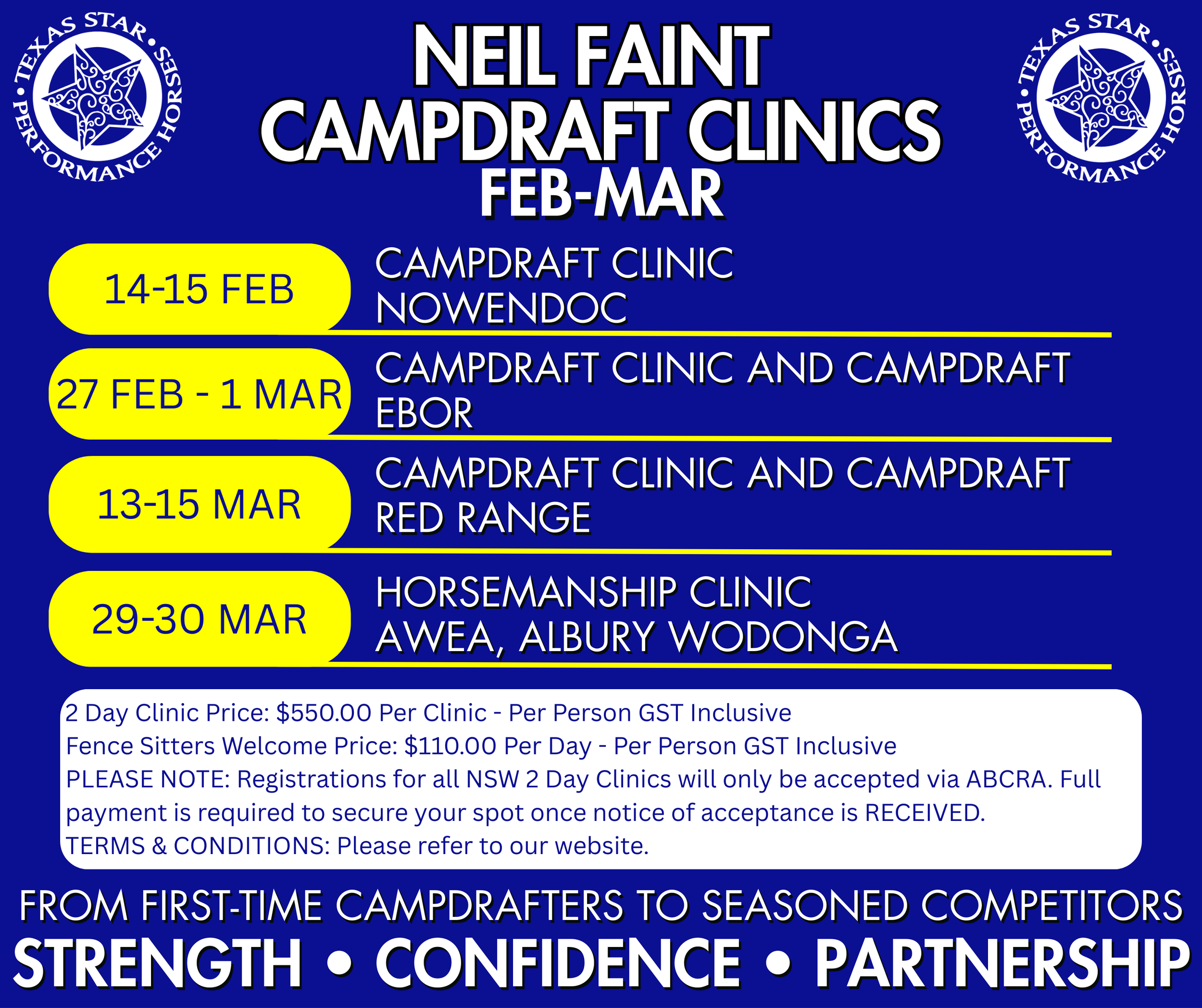 Nominations for our February and March Neil Faint Campdraft Clinics are now open via ABCRA iCompete. See dates and locations in the graphic below.
